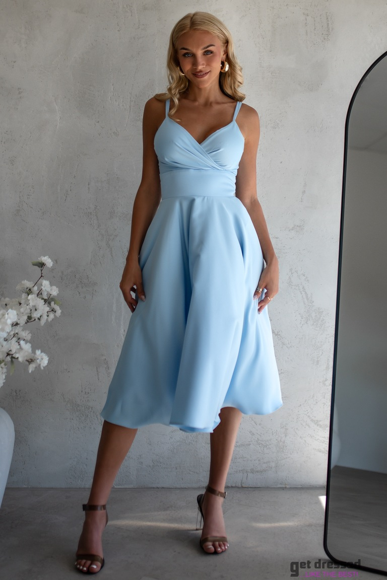 Kaunis helesinine kleit on midi pikkusega, õrnade õlapaeltega ja kauni südamekujulise kaelusega.