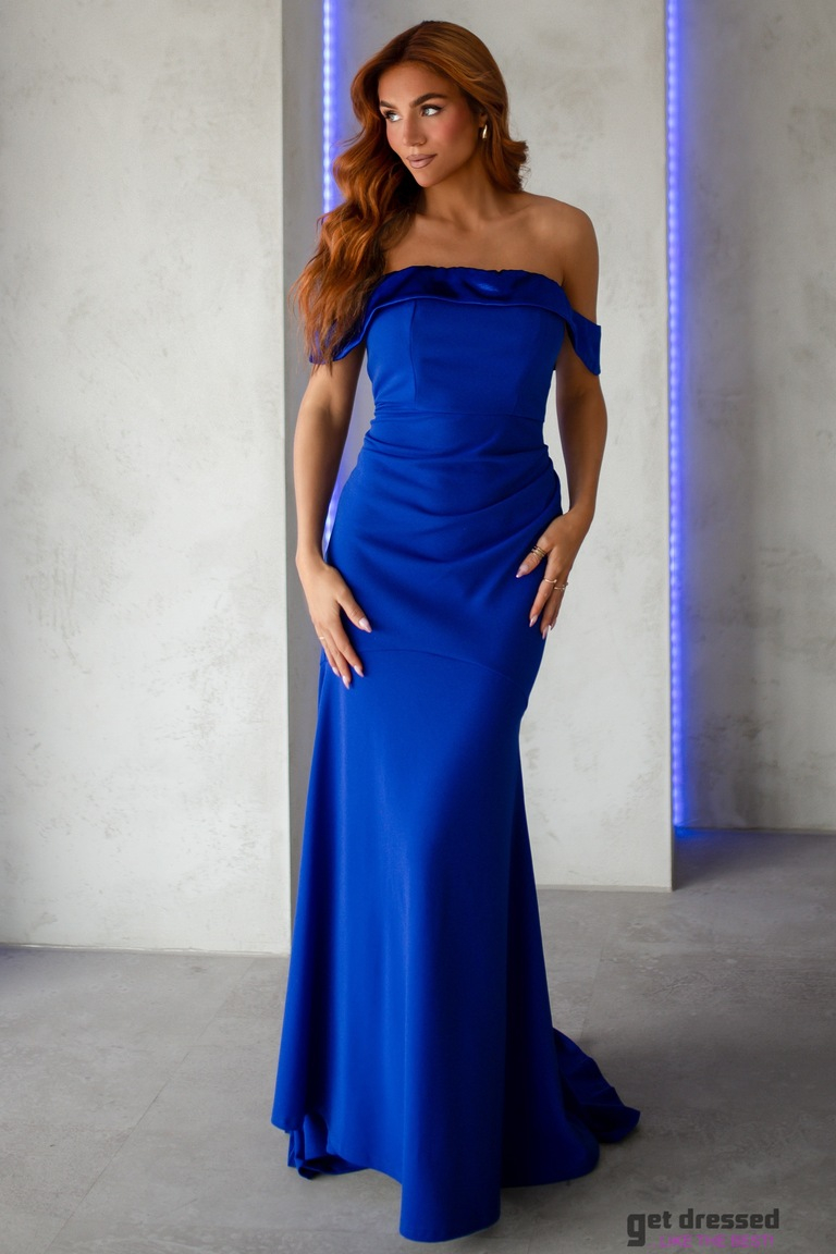 Heleene maksikleit on loodud mõeldes naise mugavusele ja enesekindlusele. Kleit on valmistatud venivast sinisest kangast, mis tagab sulle täieliku liikumisvabaduse ja mugavuse kogu sündmuse vältel. Kleidi ülemine osa on kaunistatud satiinkangast bardot-õlgadega, mis lisavad sellele elegantsust ja peenetundelisust.
